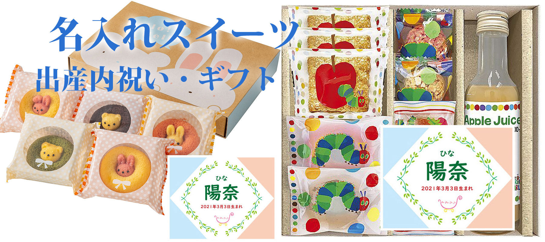 お子様のお名前や生年月日のカード入りの、出産内祝い用の名入れスイーツです。