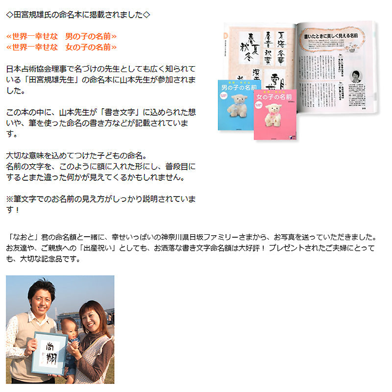 グラフィックデザインの為の書き文字をコンセプトに東京で活躍中のデザイナー「山本文字堂」による書き文字の命名書。一言メッセージも添えた作品は、きっと一生の思い出になるのではないでしょうか。