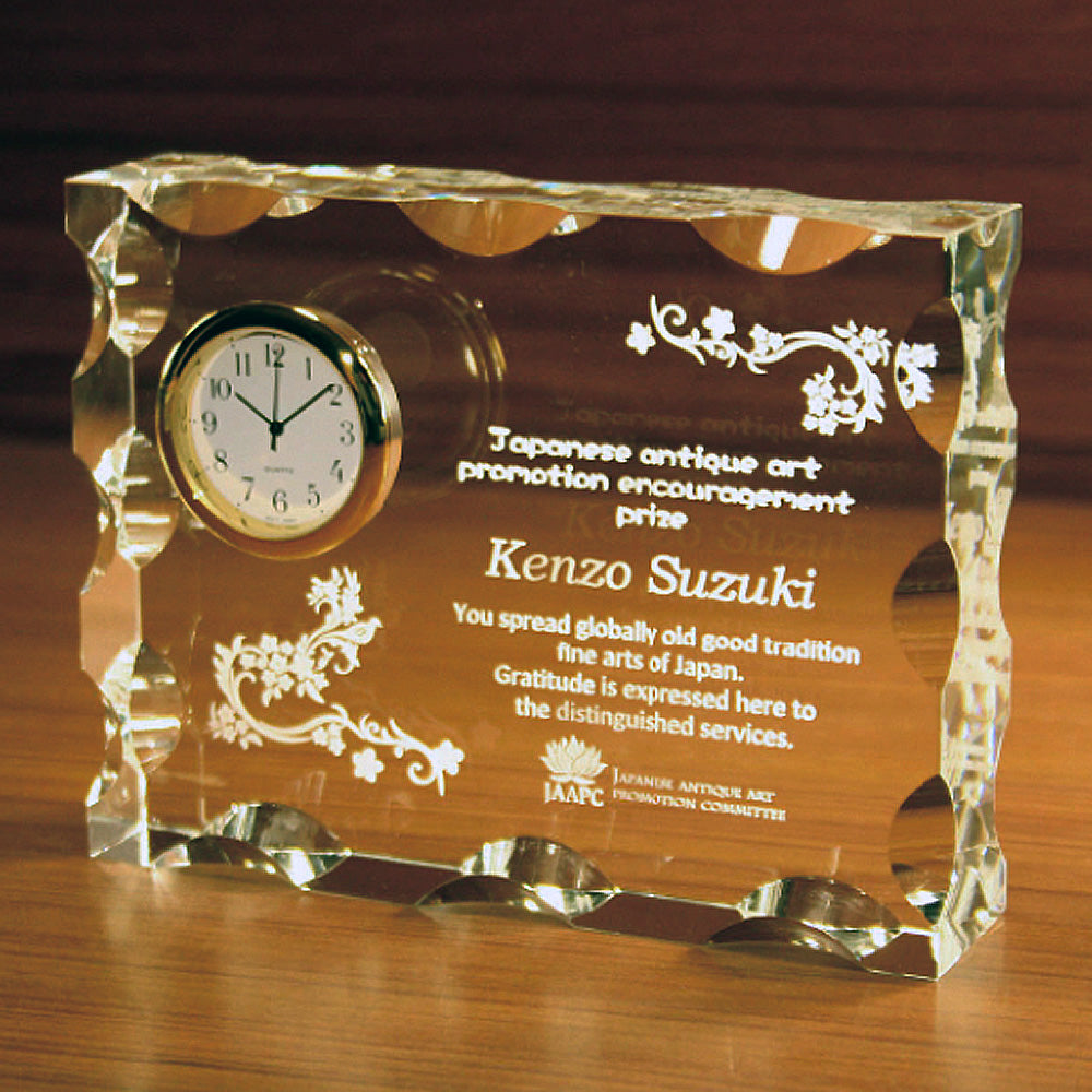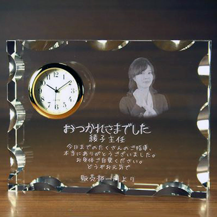 ガラスの内部にレーザー彫刻を施しオリジナルの記念品を制作いたします。オリジナルのメッセージはもちろんですが、企業のロゴ・お写真なども一緒に刻印できます。特殊なインサイドレーザー加工機で、ガラスの内部に浮かぶような刻印を施します。時計ムーブメントは、セイコー製ですから安心。