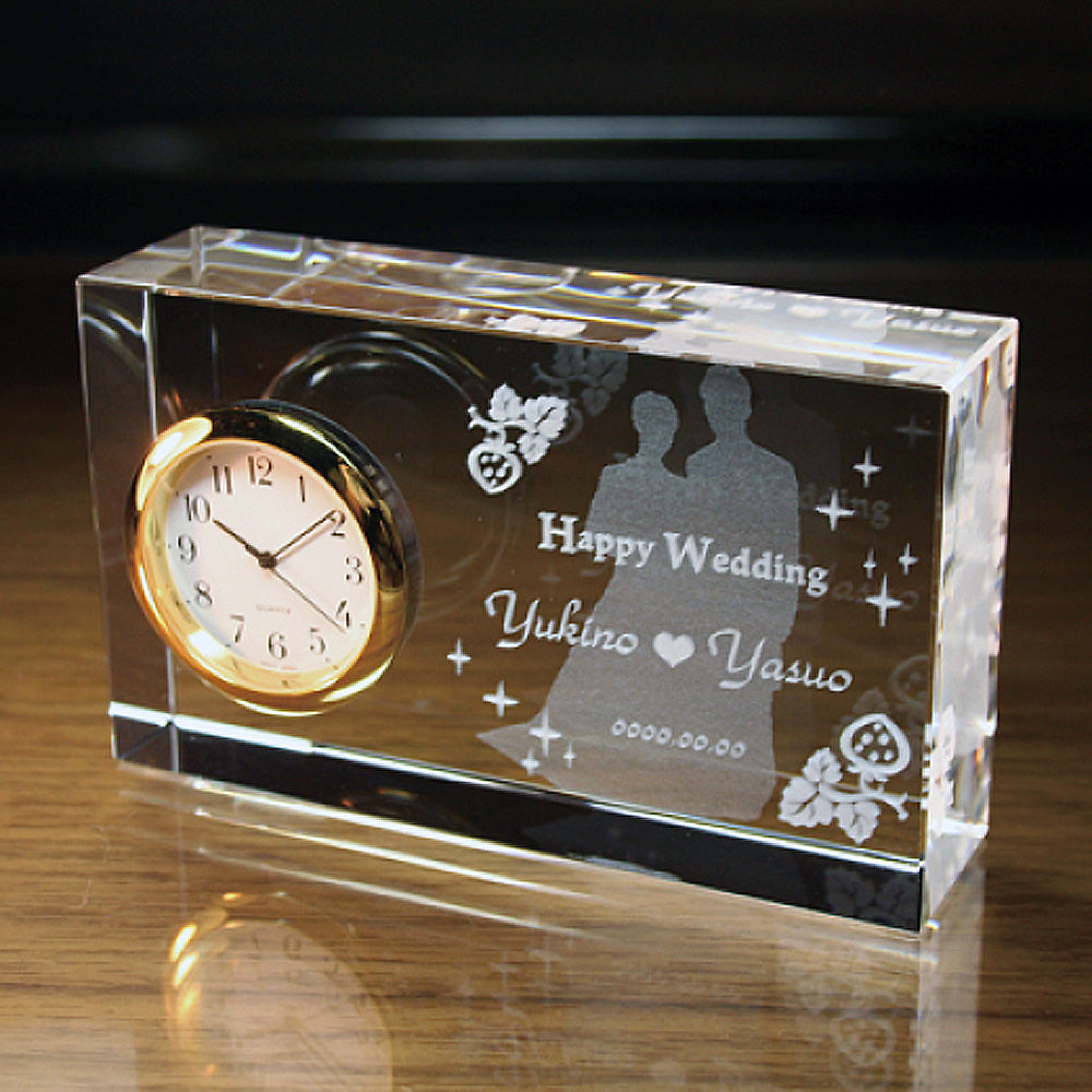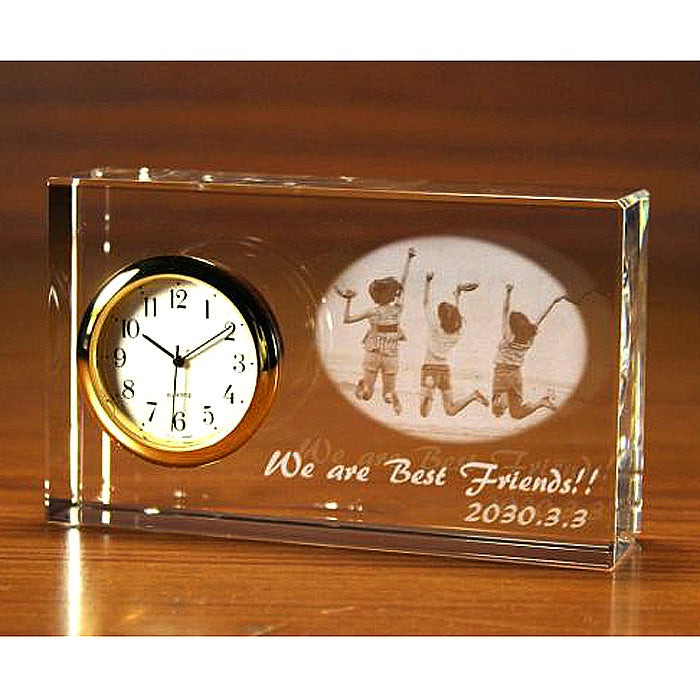 ガラスの内部にレーザー彫刻を施しオリジナルの記念品を制作いたします。オリジナルのメッセージはもちろんですが、企業のロゴ・お写真なども一緒に刻印できます。特殊なインサイドレーザー加工機で、ガラスの内部に浮かぶような刻印を施します。時計ムーブメントは、セイコー製ですから安心。
