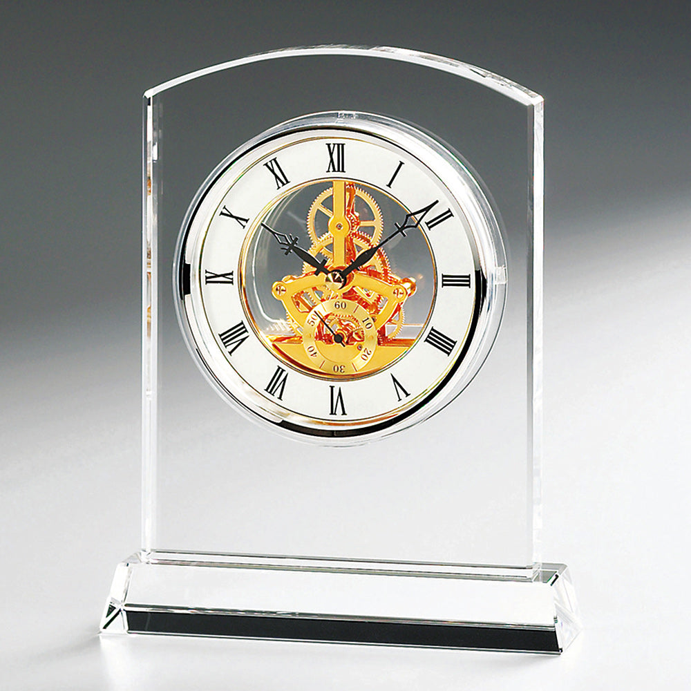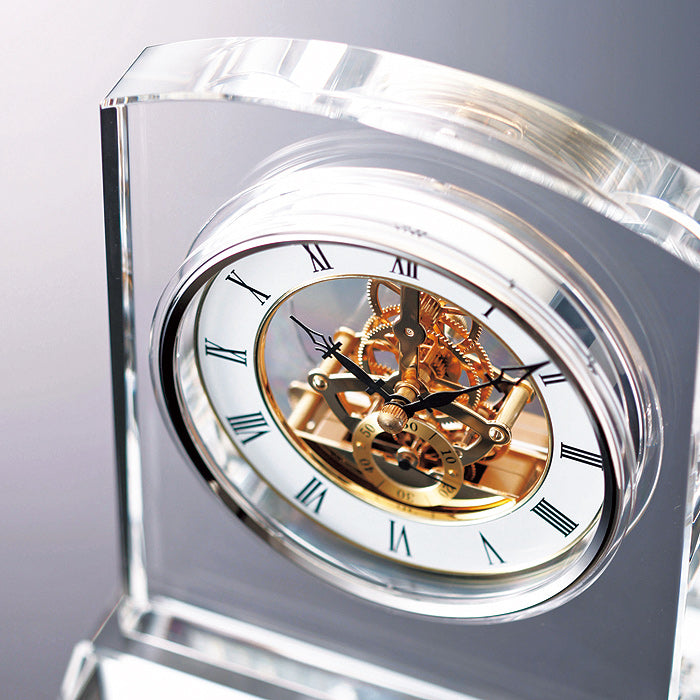 ガラス本来の純粋な透明感と、気品を感じさせるインテリアクロック。スケルトンのムーブメントが洗練されたイメージをさらに強調します。