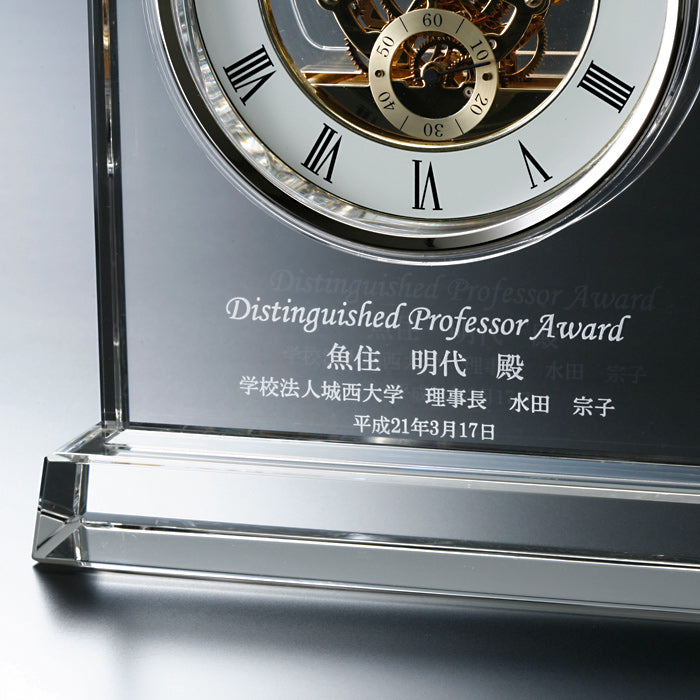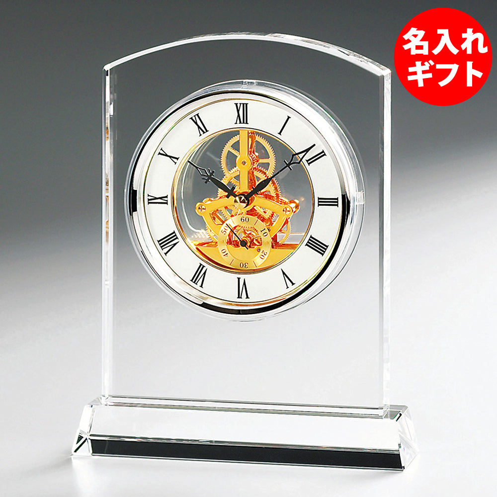 スケルトンのムーブメントがお洒落な、ガラスの置時計(名前入り)