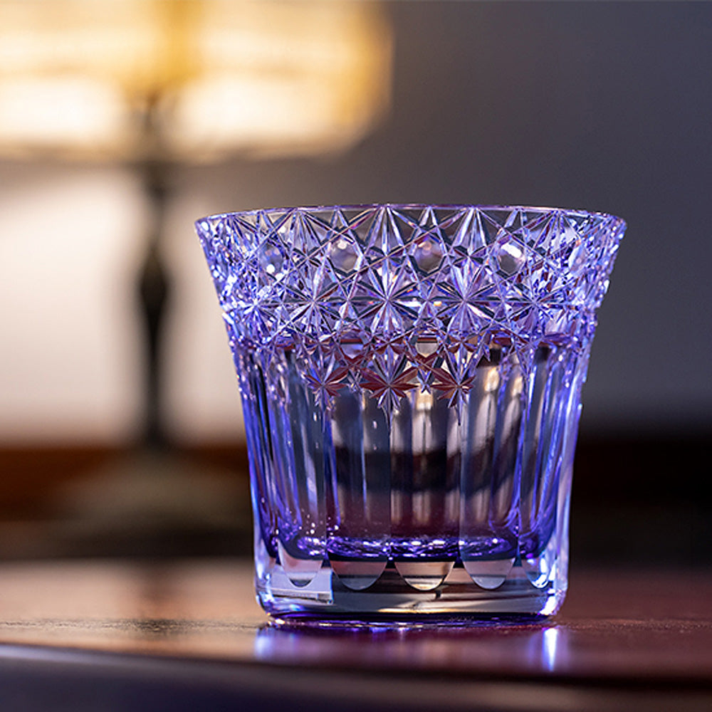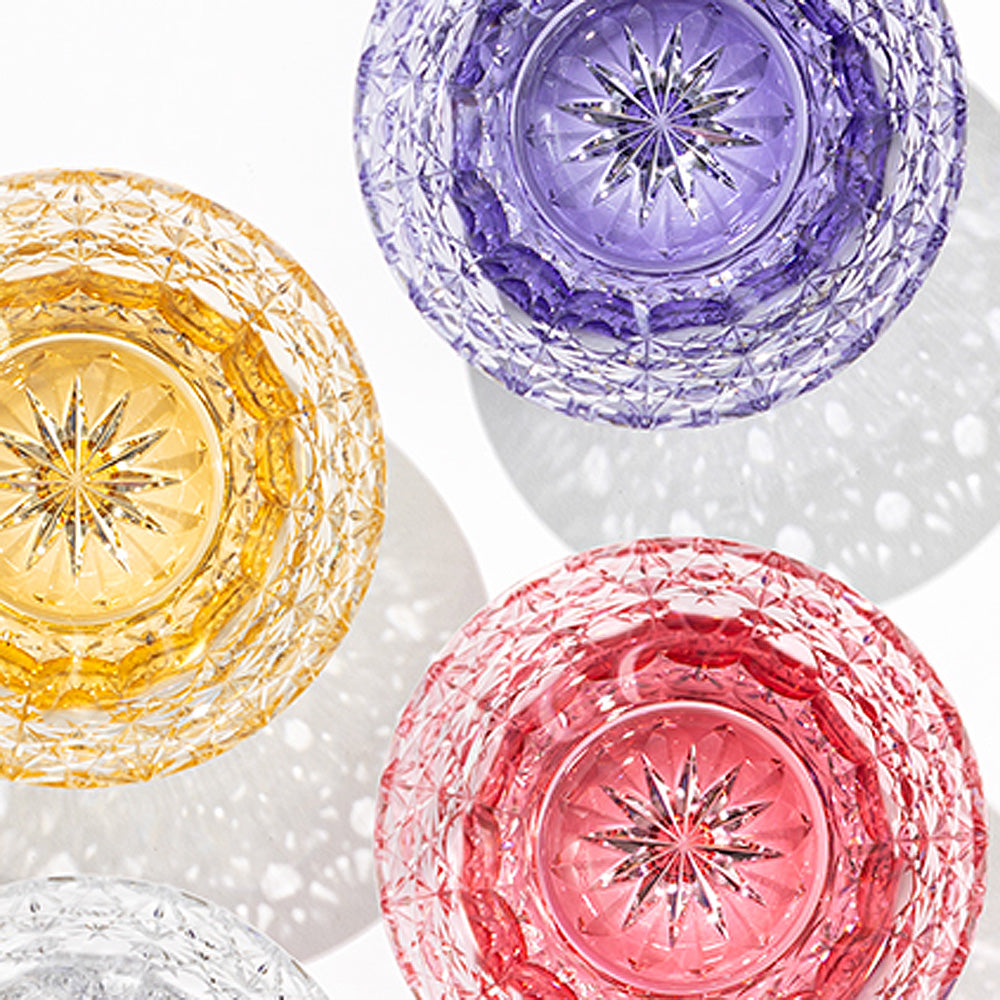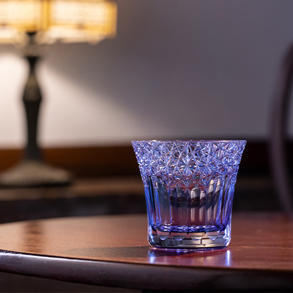 「夢色」は幻想的な輝きで大人のライフスタイルを彩ります。内被せガラスの鮮やかで深みのある色彩が様々なシーンに寄り添い、繊細な江戸切子が、夢のようにリラックスした空間を演出します。