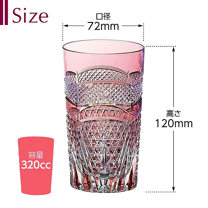 鮮やかなブルーとレッドの色被せクリスタルに、「魚子に六角籠目」の切子模様を刻んだ、使いやすいシンプルな形状のグラスです。