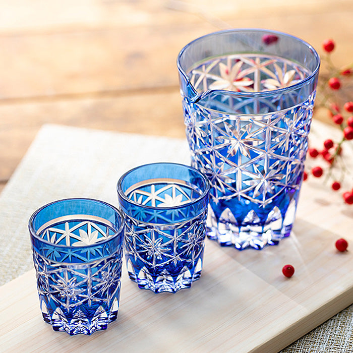 空に連なる星々をイメージした酒器揃え「星花」。江戸切子伝統紋様「麻の葉」をアレンジしたデザインが華やかな雰囲気を演出し、特別な席やおもてなしの場を盛り上げます。また、注ぐたびに飲み物が輝き、大切な人との素敵な時間を彩ります。贈り物としてもお勧めの一品です。