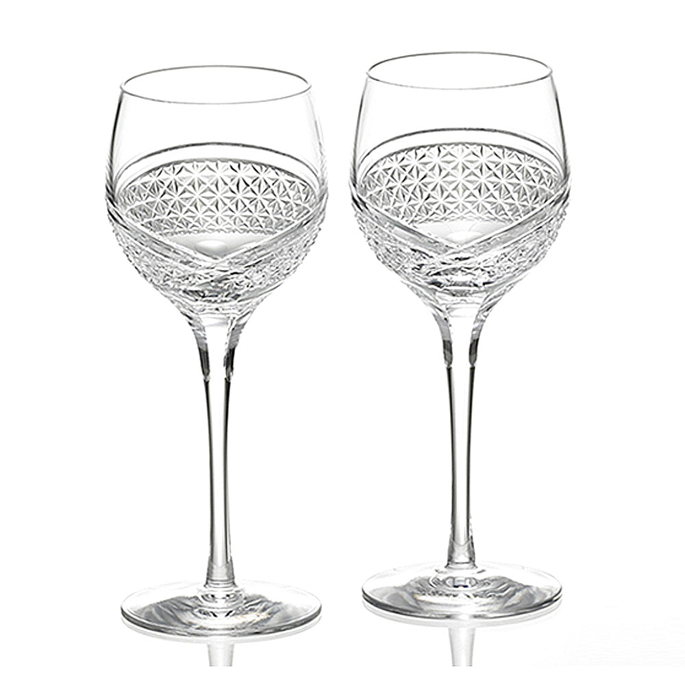 KAGAMIクリスタル初めての透明なクリスタルガラスの江戸切子ペアワイングラス。着物の衿元をイメージしたやわらかな曲線は、天女が羽織る「羽衣」を思わせます。 ワインを美しくみせる、丸みを帯びた形状も特徴的。