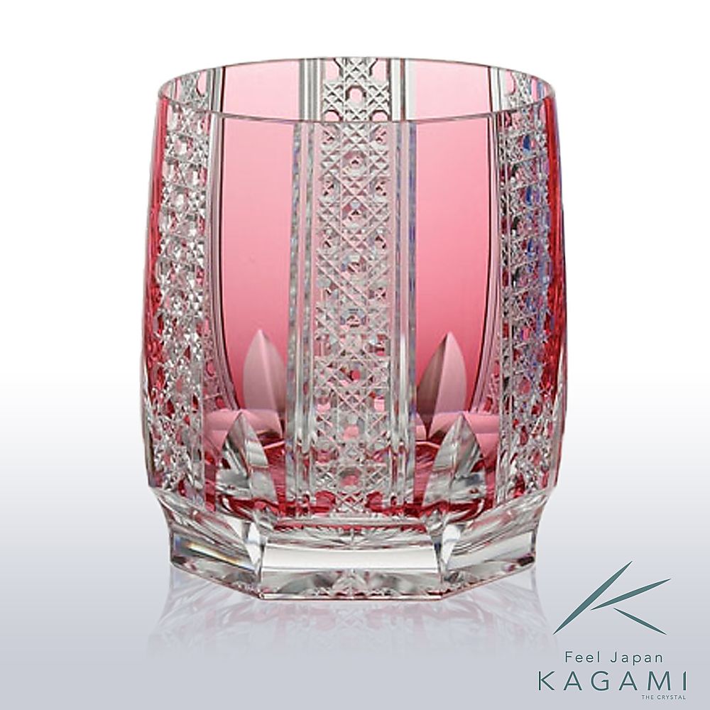 鮮やかな赤と切子模様が特徴のカガミクリスタルロックグラス