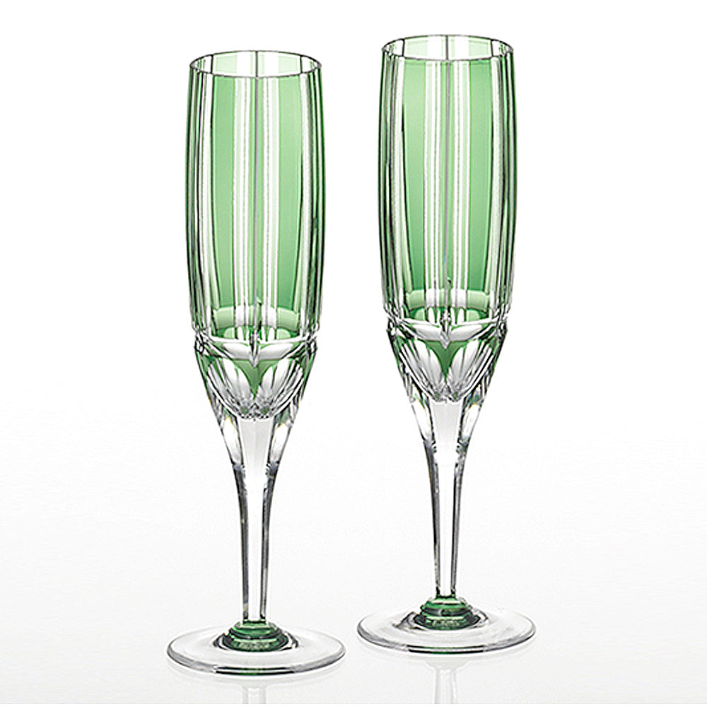 新緑の青竹をイメージした竹の膳のペアフルートシャンパングラスです。シンプルなカットと透明感のあるグリーンは、立ち上るシャンパンの泡をより美しく引き立てます。
