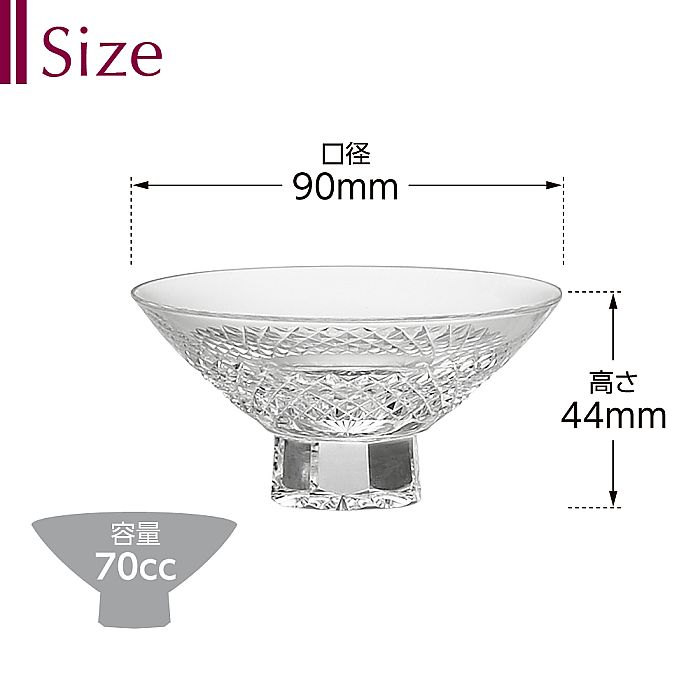 古くから日本で親しまれてきた平盃の形状はそのままに、シンプルでありながらも細部にまでこだわりが感じられる江戸切子文様をカットデザインに。洗練された美しさが際立つ一品となっています。