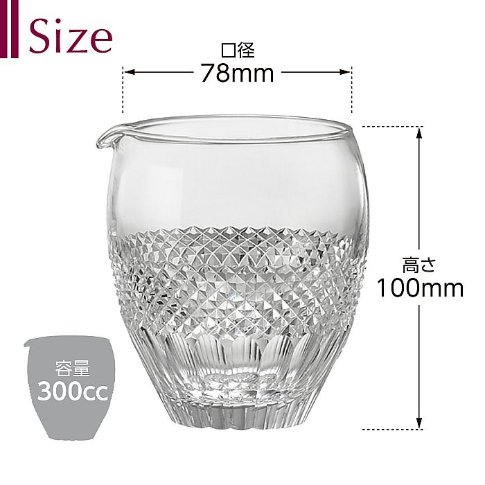 すっきりとした形状に、シンプルでありながら細部までこだわり抜いた江戸切子文様を施しました。また口が広いのでお酒が注ぎやすく、お手入れも簡単。デザインはもちろん、使い勝手にもこだわった一品となっています。