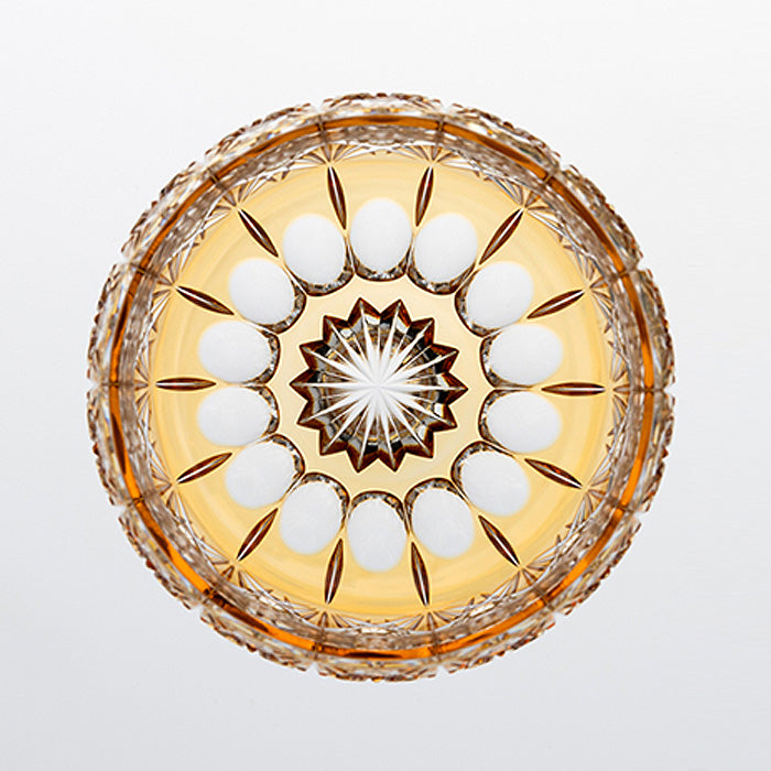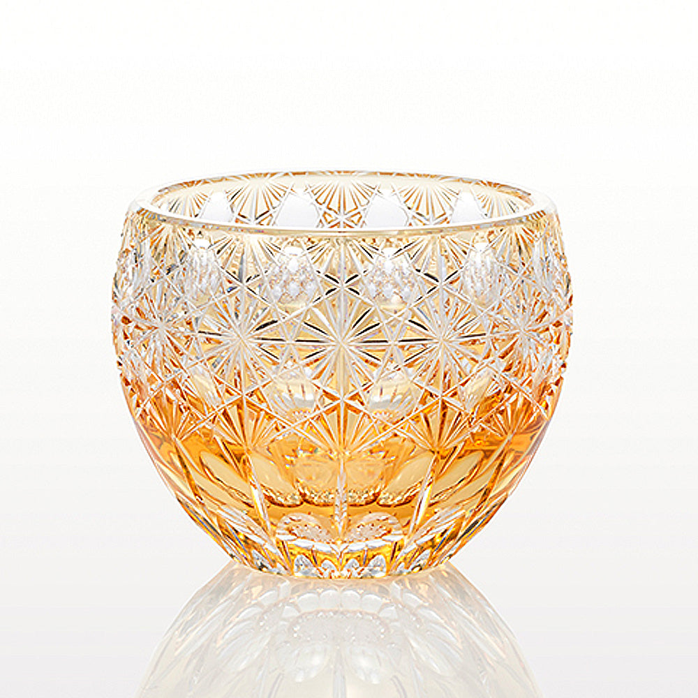 熟達した技術、そして伝統工芸に関する知識と経験、それら全てを満たし指定の試験に合格した者のみが、「伝統工芸士」という名称を名乗ることを許されます。こちらはその伝統工芸士に認定された鍋谷淳一氏がデザイン・カットを施した冷酒杯です。 菊つなぎと玉カットを組み合わせた、玉菊つなぎが特徴的で、使用する場の雰囲気を華やかに演出します。