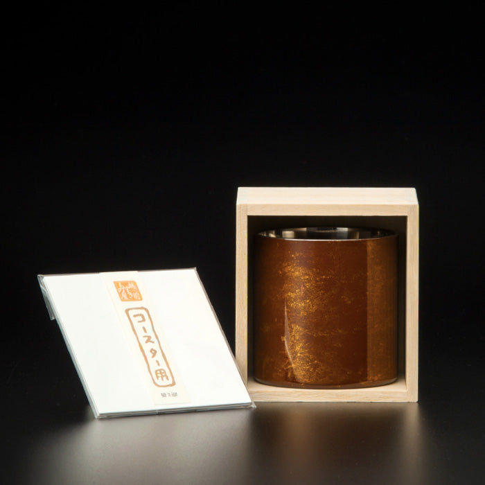 独自の「漆流し」の手法で金粉をちりばめ、きらめく流水のような模様を再現しています。安定感あるどっしりとしたフォルムの天然素材である漆を使った器には、愛用しながら育てる楽しさがあります。(二重構造で保冷性有り)