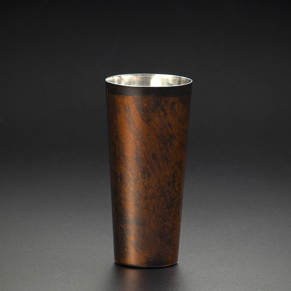 独自の「漆流し」の手法で金粉をちりばめ、きらめく流水のような模様を再現しています。上部を鏡面磨き、下部は螺旋磨きすることによりクリーミーな泡が生まれます。天然素材である漆を使った器には、愛用しながら育てる楽しさがあります。(二重構造で保冷性有り)