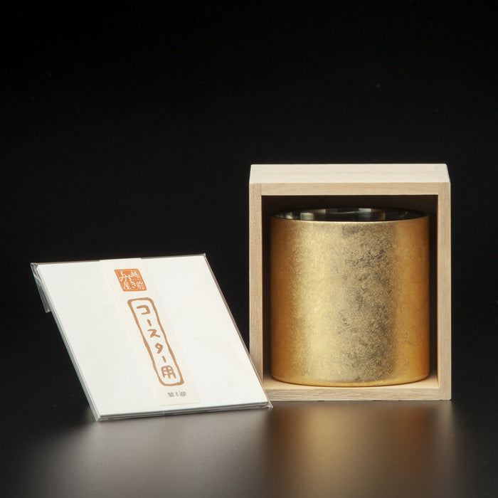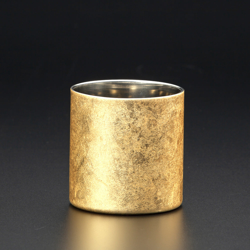 箔職人が一つ一つ金箔を手作業で貼り合わせる「切り回し」という技法を用い、仕上げは山中塗の伝統的な拭き漆を施し金箔の風合いを残しています。安定感のあるどっしりとしたフォルムで口当たりも滑らか。(二重構造で保冷性有り)