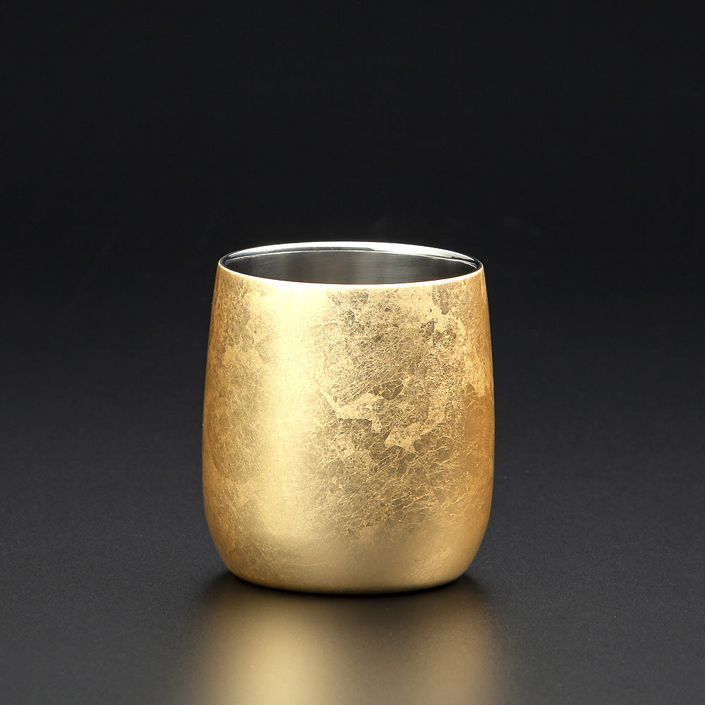 箔職人が一つ一つ金箔を手作業で貼り合わせる「切り回し」という技法を用い、仕上げは山中塗の伝統的な拭き漆を施し金箔の風合いを残しています。手に馴染む丸みを帯びたフォルムで口当たりも滑らか。(二重構造で保冷性有り)