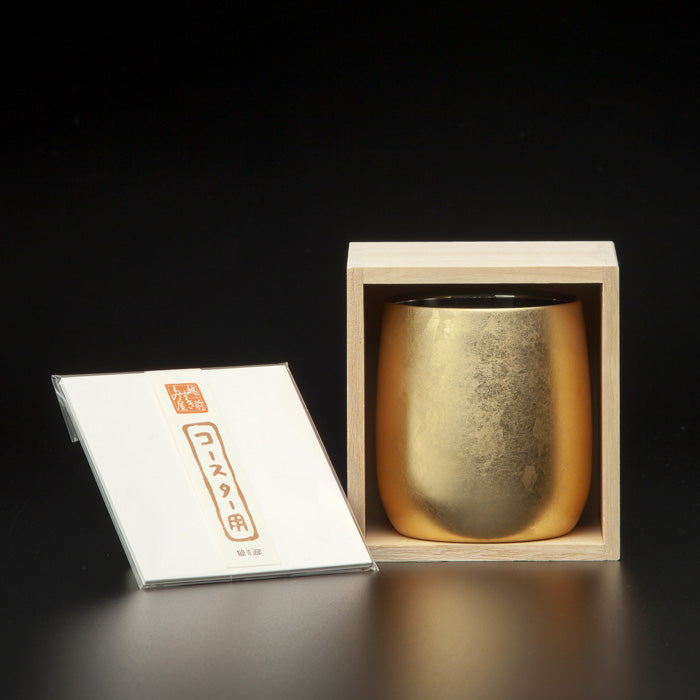 箔職人が一つ一つ金箔を手作業で貼り合わせる「切り回し」という技法を用い、仕上げは山中塗の伝統的な拭き漆を施し金箔の風合いを残しています。手に馴染む丸みを帯びたフォルムで口当たりも滑らか。(二重構造で保冷性有り)