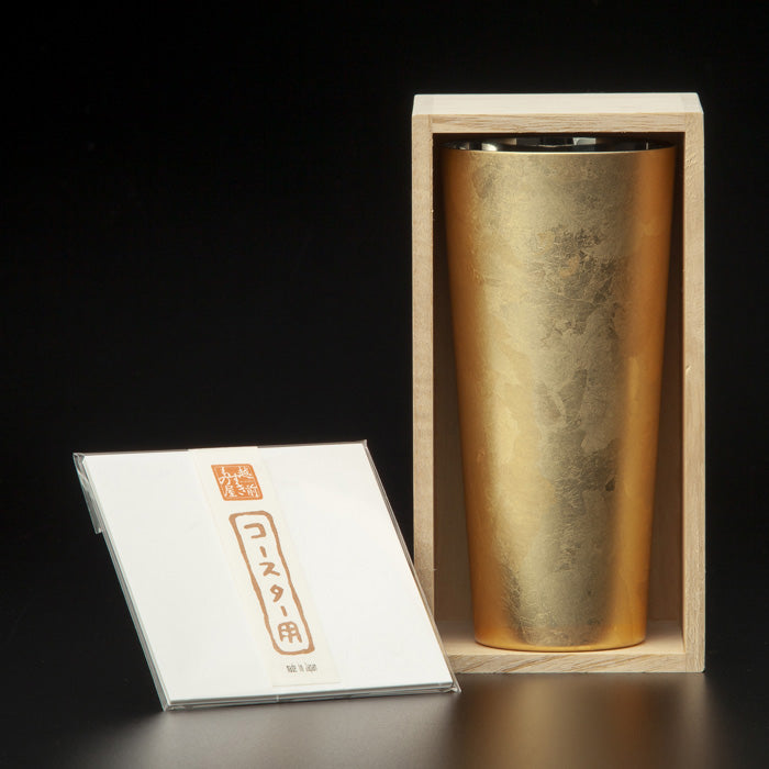 箔職人が一つ一つ金箔を手作業で貼り合わせる「切り回し」という技法を用い、仕上げは山中塗の伝統的な拭き漆を施し金箔の風合いを残しています。上部を鏡面磨き、下部は螺旋磨きすることにより勢いよくクリーミーな泡が生まれます。(二重構造で保冷性有り)