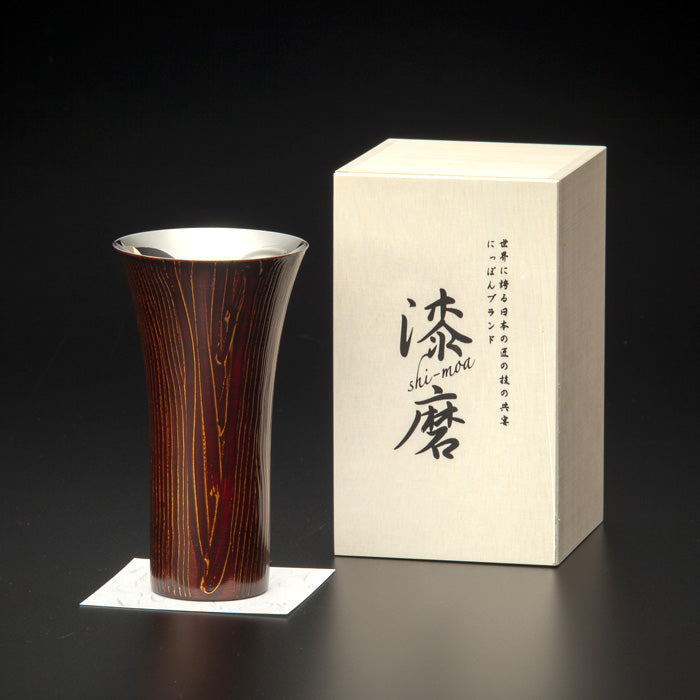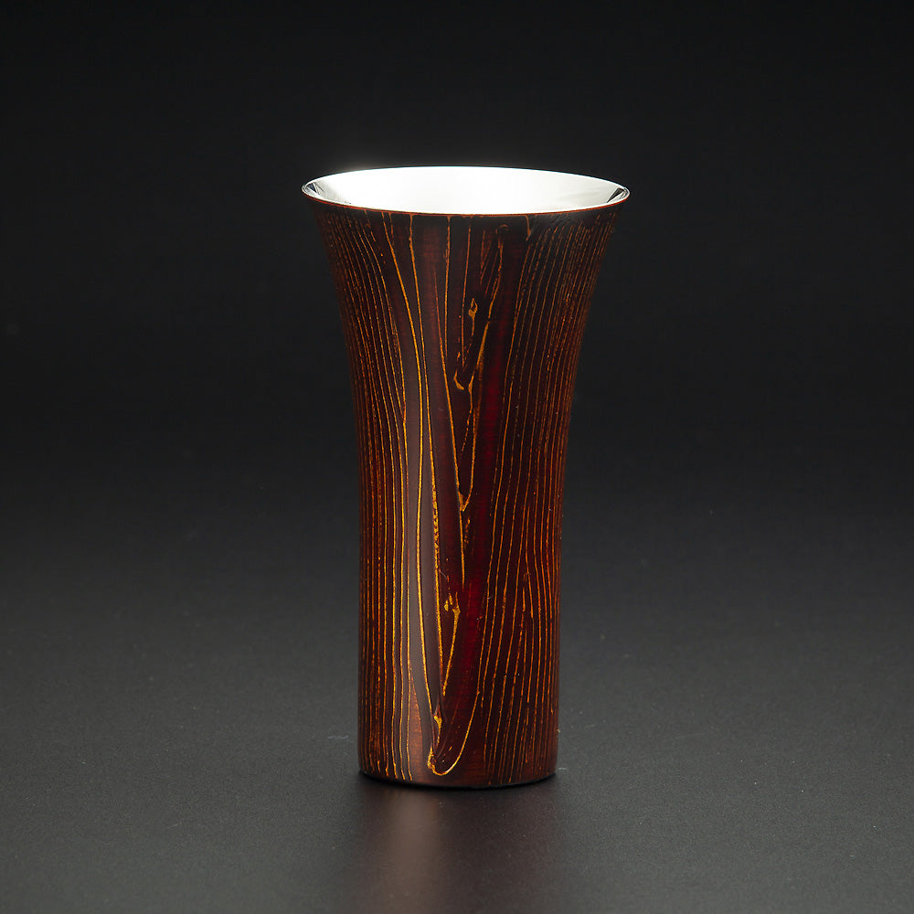 職人が手作業で描き出した模様は、漆の色合いと細やかな塗りの技法によって、自然の中で年月を重ねた古木の風合いを再現しています。上部を鏡面磨き、下部は螺旋磨きすることにより勢いよくクリーミーな泡が生まれます。(二重構造で保冷性有り)