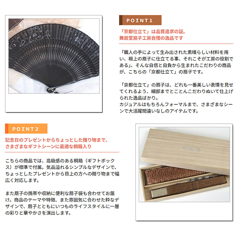 尚、こちらの商品は舞扇堂扇子工房が自信を持ってお届けする「京都仕立て」認定品。素材はもちろん、製法に至るまでこだわり抜いて仕上げた極上の一本です。