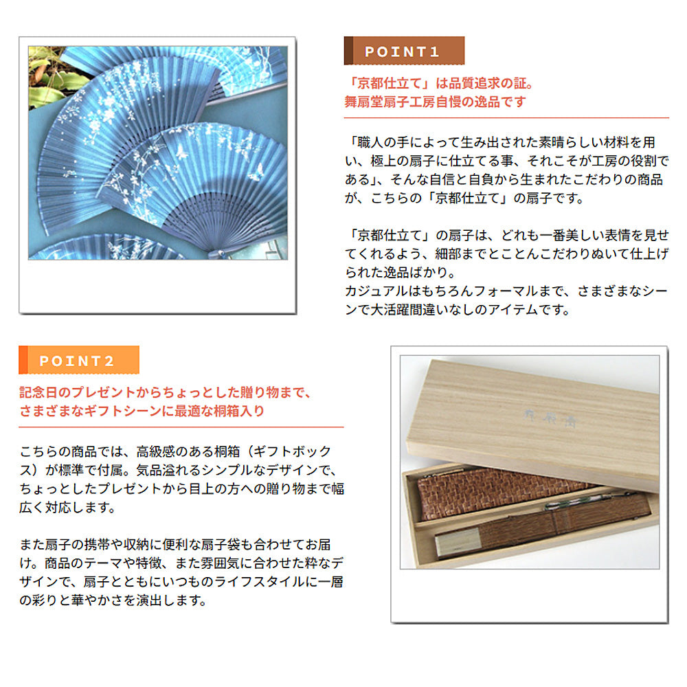 尚、こちらの商品は舞扇堂扇子工房が自信を持ってお届けする「京都仕立て」認定品。素材はもちろん、製法に至るまでこだわり抜いて仕上げた極上の一本です。