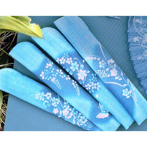 藍色のぼかしがアクセント。日本製の竹と生地に、京都の職人による手染めと仕立てを施し生まれたのがこちらの藍乃町です。付属の扇子袋は扇面と同じモチーフが両面に入っており、どの角度から見ても美しい仕上がりになっています。