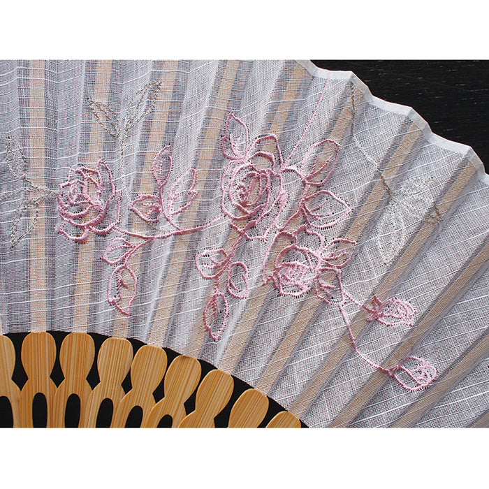 ナチュラルなコットン生地にシンプルステッチ、表現豊かな刺繍で描かれるバラの花々。扇面になじむバラ柄刺繍に輝く葉のステッチ刺繍。