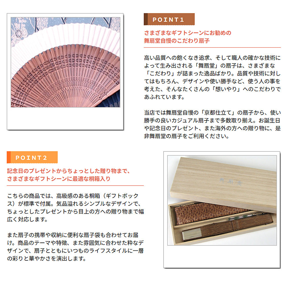 その他携帯・収納に便利なお洒落な扇子袋、また各種ギフトシーンに最適な高級感のある桐箱も併せてお届けします。