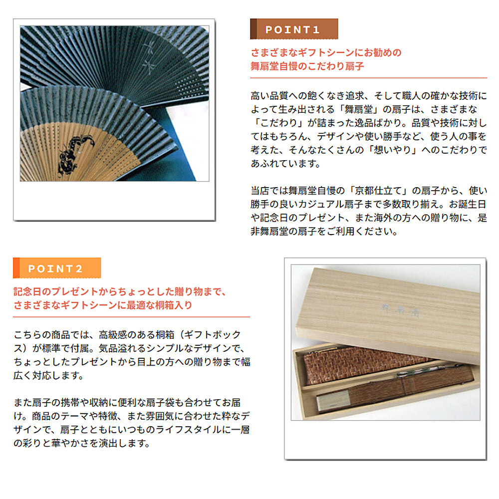 その他携帯・収納に便利なお洒落な扇子袋、また各種ギフトシーンに最適な高級感のある桐箱も併せてお届けします。