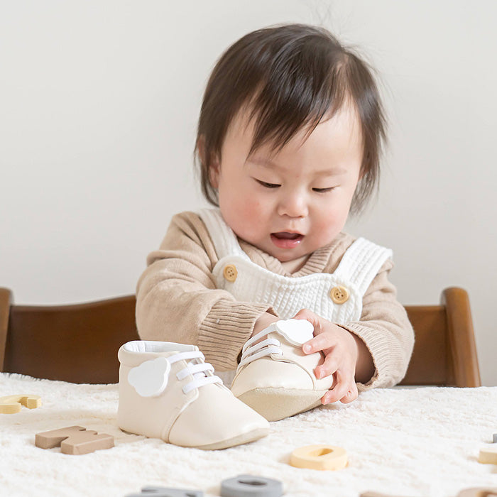 柔らかな合皮と内側のパイル地が快適な履き心地を提供します。特に紐部分がゴムで仕上げられておりお子様の足にピッタリとフィットします。