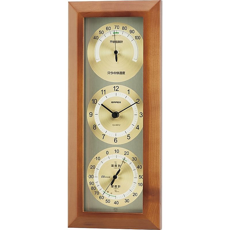 時計・温度計・湿度計・不快指数計、天然木とゴールドトーンの計器が程よくマッチしたインテリア時計