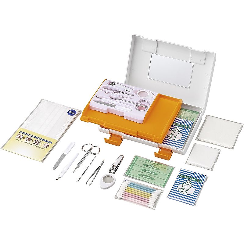 - 商品内容:セット内容/カラー綿棒×10、ガーゼ(中)×5、キズテープ・コットンパフ×各3、マスク×2、専用ケース(鏡付)(19.5×14.5×4.5cm)・爪切り・エチケットハサミ・耳かき・毛抜き兼ピンセット・爪ヤスリ・キューティクルカッター・ルーペ・ワンタッチ包帯×各1 材質/専用ケース:HIPS樹脂、爪切り・エチケットハサミ・耳かき・毛抜き兼ピンセット・爪ヤスリ・キューティクルカッター:スチール、ルーペ:ABS樹脂 箱サイズ/14.7×20×4.5cm 原産国/日本/中国/タイ 補足/キズテープ医療機器届出番号:27B3X00138000001
