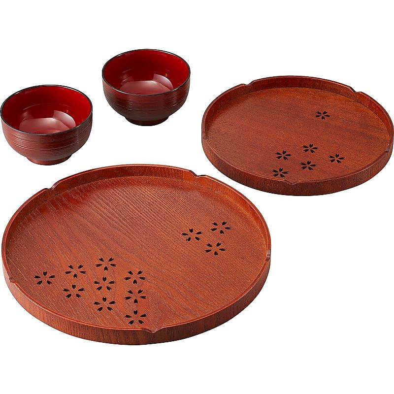 - 商品内容:セット内容/汁椀(φ11.2×6.2cm)×2、8.0丸盆(φ24×2cm)・10.0丸盆(φ30×2cm)×各1 材質/丸盆:木製(漆塗)、汁椀:PET(ウレタン塗装) 箱サイズ/32×31.5×9cm 原産国/中国/日本 機能/【電子レンジOK】汁椀のみ