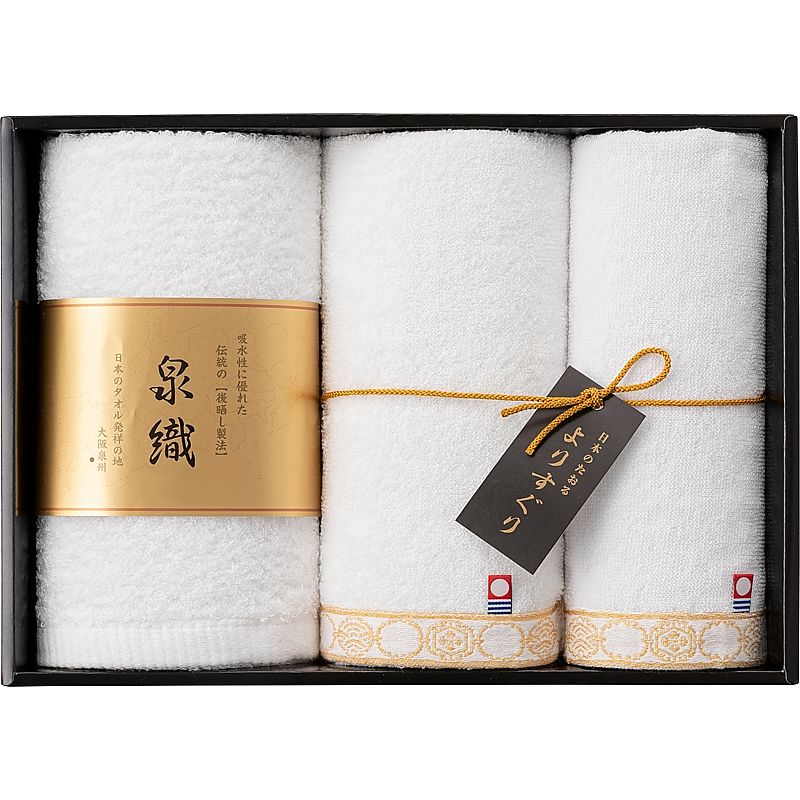- 商品内容:セット内容/泉州フェイスタオル・今治フェイスタオル(各34×80cm)・今治ハンドタオル(34×36cm)×各1 材質/綿100% 箱サイズ/24×34×6cm 原産国/日本 機能/JPN・今治マーク(第2017-1870号)
