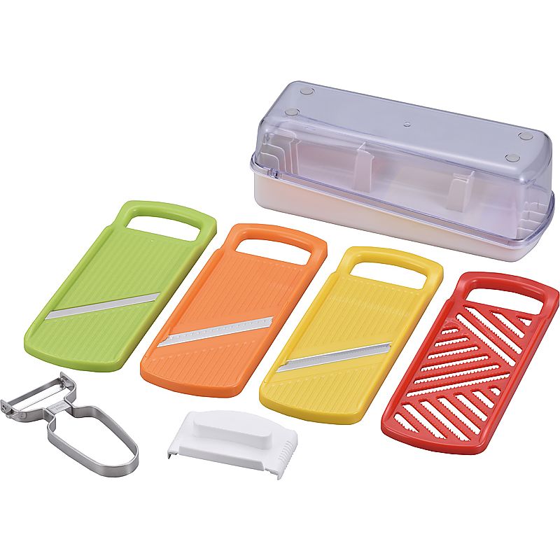 - 商品内容:セット内容/スライサー・千切り・つま切り・おろし・ステンレスピーラー・安全ホルダー・収納ケース(23.5×8.5×8.8cm)・容器×各1 材質/プレート類・収納ケース:ABS樹脂、刃:ステンレス鋼、安全ホルダー:ポリプロピレン、受け容器:AS樹脂、ピーラー:ステンレス鋼・ステンレス刃物鋼 箱サイズ/9.5×26×9.5cm 箱入重量/0.5kg 原産国/日本 機能/日本製