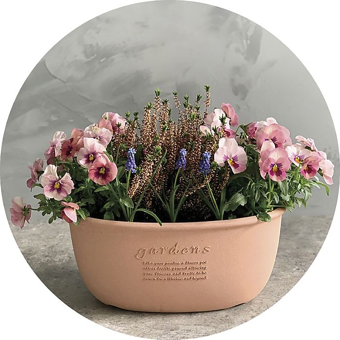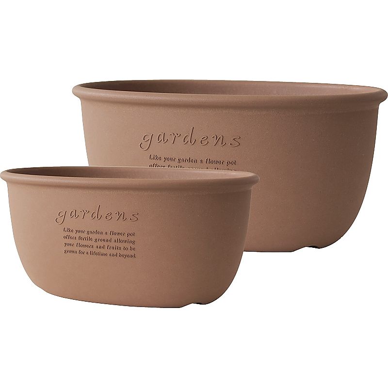 環境に優しい素材を使用したエコプランター2個組。天然素材(木粉)を融合した樹脂原材料を用いることで、より自然に近い風合いが表現でき、温かみのあるお洒落なガーデニングを演出することができます。軽くて丈夫なプラスチックの利点と天然素材ならではの質感、使うほどに味が増す経年劣化お楽しみのひとつです。寄せ植えや家庭菜園に適した、やわらかな曲線のオーバルプランターです。日本製。