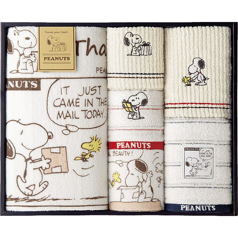 ギフトを抱えたスヌーピーと一緒にありがとうの気持ちが伝わるタオルシリーズです。