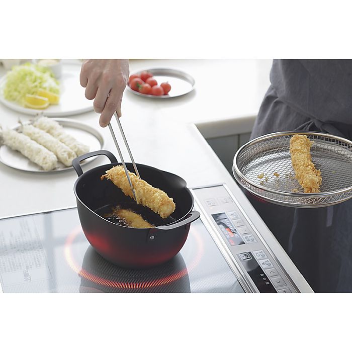 注ぎやすい口形状が特長の鉄製揚げ鍋。ボリュームのあるカツやエビフライ等も余裕を持って調理でき、使用後はコンパクトに収納出来る小判型ボディです。小ぶりながら深さがあるので調理時の油ハネも側面がガードし飛び散りを防ぎます。注ぎやすい口と両手でしっかり握れる取っ手で油の移し替えも楽々。
