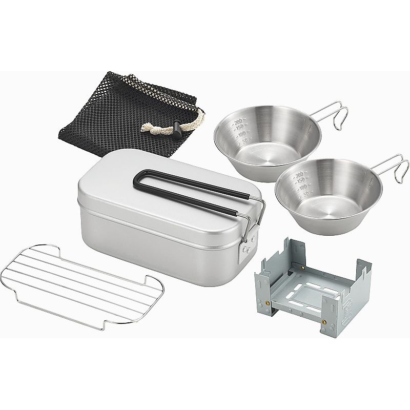 - 商品内容:セット内容/シェラカップ(17.5×12.5×4.2cm・300ml)×2、メスティン(29×9.8×6.6cm ・750ml)・メッシュトレー(15.9×8.8×1.5cm)・折畳み簡易コンロ(10.2×7.5×5.5cm)・収納袋(29×26.5cm)×各1 材質/メスティン本体:アルミニウム(アルマイト加工)、フタ:アルミニウム、ハンドル:ステンレス鋼・シリコーンゴム、折畳み簡易コンロ:亜鉛メッキ鋼板、メッシュトレー・シェラカップ:ステンレス鋼、収納袋:ポリエステル 箱サイズ/23.5×18.5×8cm 箱入重量/.6 原産国/中国
