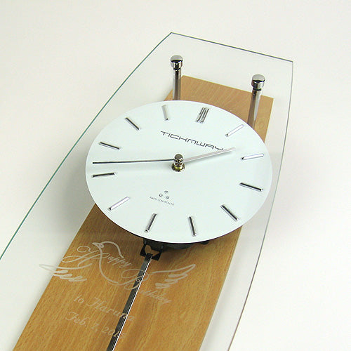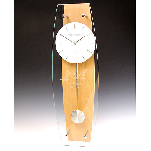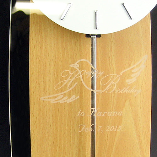 広いガラス面に柄やメッセージをたっぷり刻める、振り子掛け時計(名前入り)