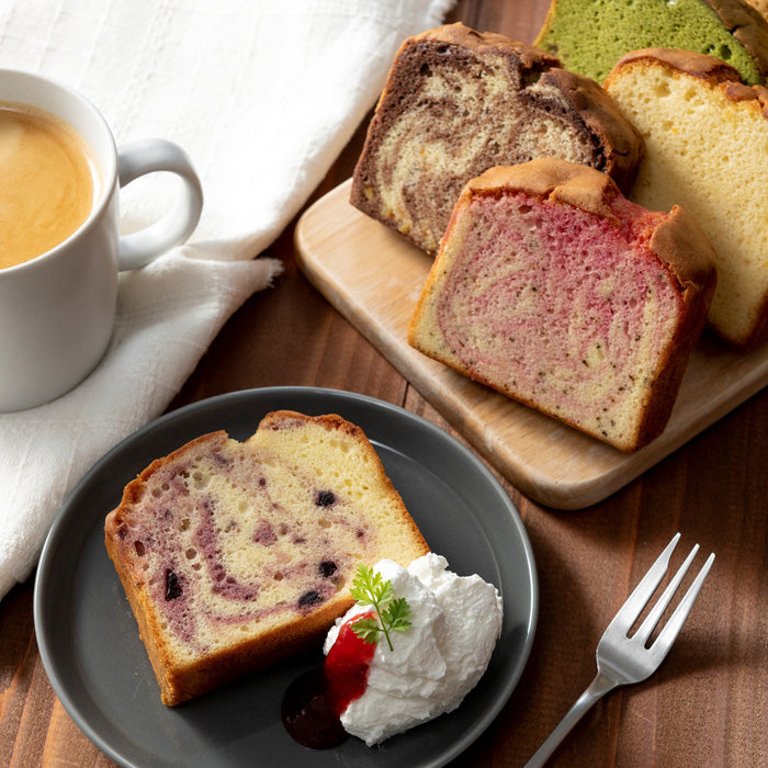 フルーツを混ぜ込んだ大きなしっとりパウンドケーキです。ずっしりとしたサイズ感ですが、ふんわり軽い食感で意外にぺろりと食べられます。朝食代わりやデザートにも。フルーツとフレーバーが組み合わさったそれぞれの味わいをお楽しみください。