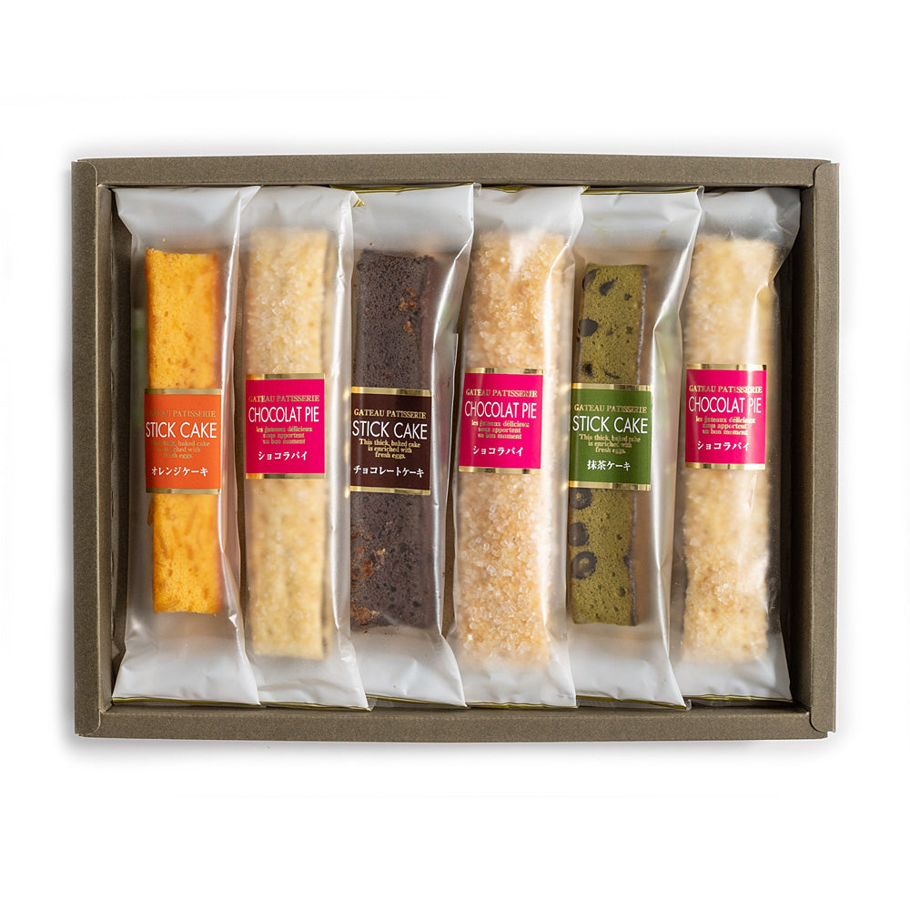 - セット内容:ショコラパイ×3本、スティックケーキ(抹茶・オレンジ・チョコレート×各1本)