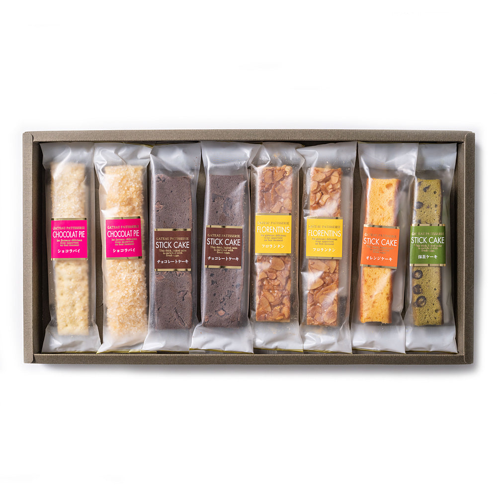 - セット内容:ショコラパイ・フロランタン×各2本、スティックケーキ(チョコレート×2本、オレンジ・抹茶×各1本)