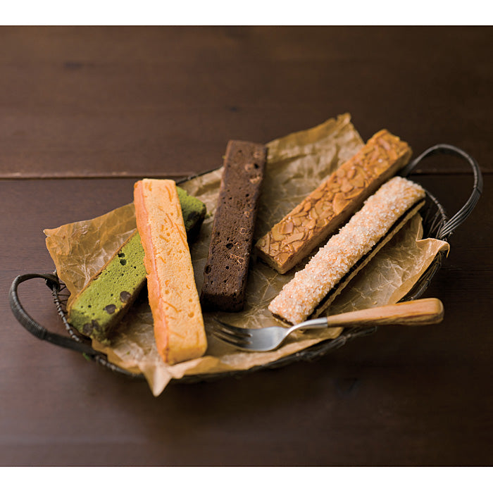 オレンジピールをふんだんに練り込んだ「オレンジ」、カカオのほろ苦さが香る「チョコレート」、大納言小豆と国産抹茶がベストマッチな「抹茶」のパウンドスティックケーキと、フロランタン、ショコラパイをセットに。上品に食べられるスティックタイプは大人にも喜ばれるケーキです。