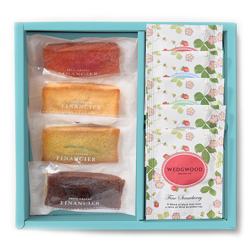 - セット内容:フィナンシェ(ストロベリー・プレーン・ピスタチオ・チョコ×各1個)、ワイルド ストロベリーティーバッグ(ファイン ストロベリー×2袋、ピクニック・ウィークエンド モーニング・アール グレイ フラワーズ×各1袋)※フィナンシェはウェッジウッドの商品ではありません。