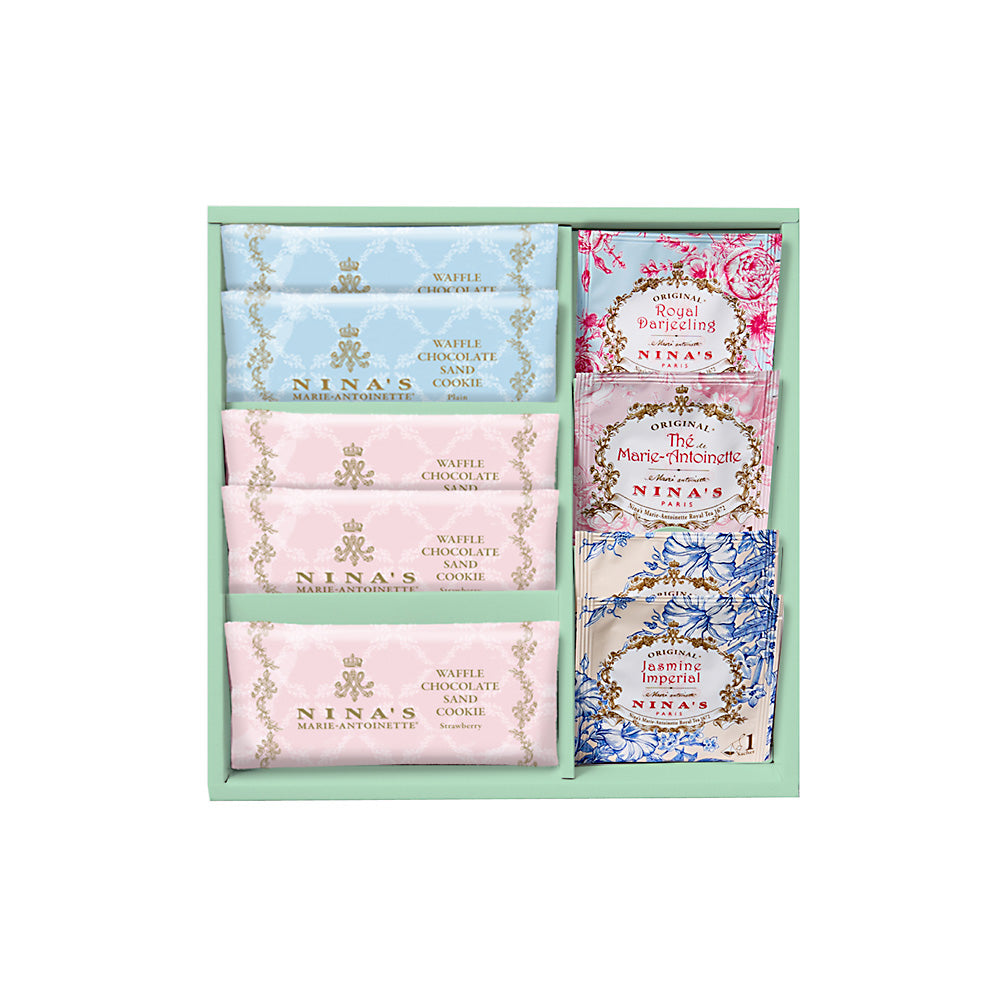 ヴェルサイユで栽培された希少なバラやリンゴが香るフレーバーティーなど、王妃マリー・アントワネットのラグジュアリー・ティーをイメージしたニナスの紅茶と、チョコレートをサンドした香ばしいワッフルクッキーをセットでお届けします。