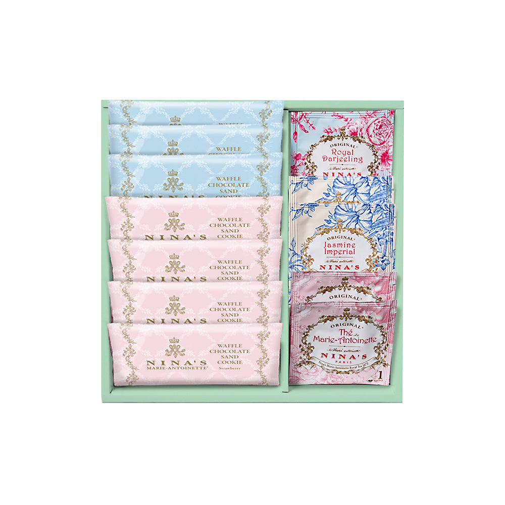 ヴェルサイユで栽培された希少なバラやリンゴが香るフレーバーティーなど、王妃マリー・アントワネットのラグジュアリー・ティーをイメージしたニナスの紅茶と、チョコレートをサンドした香ばしいワッフルクッキーをセットでお届けします。