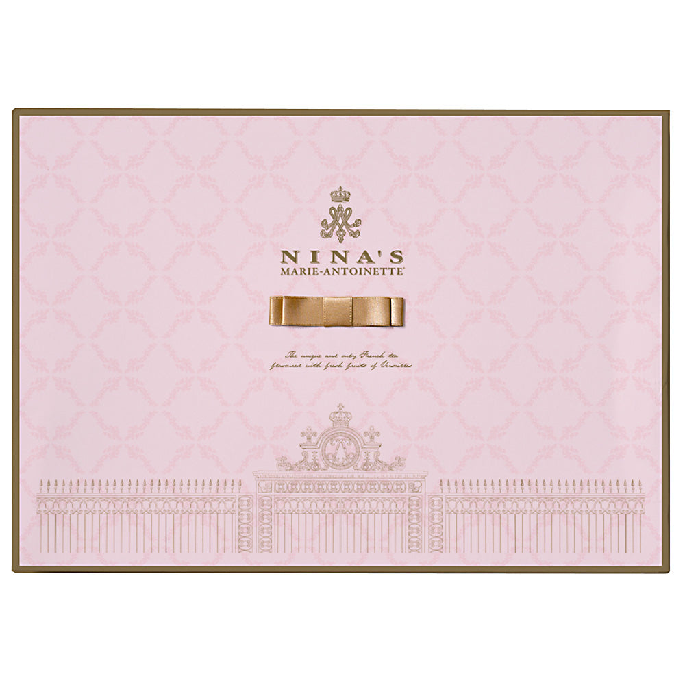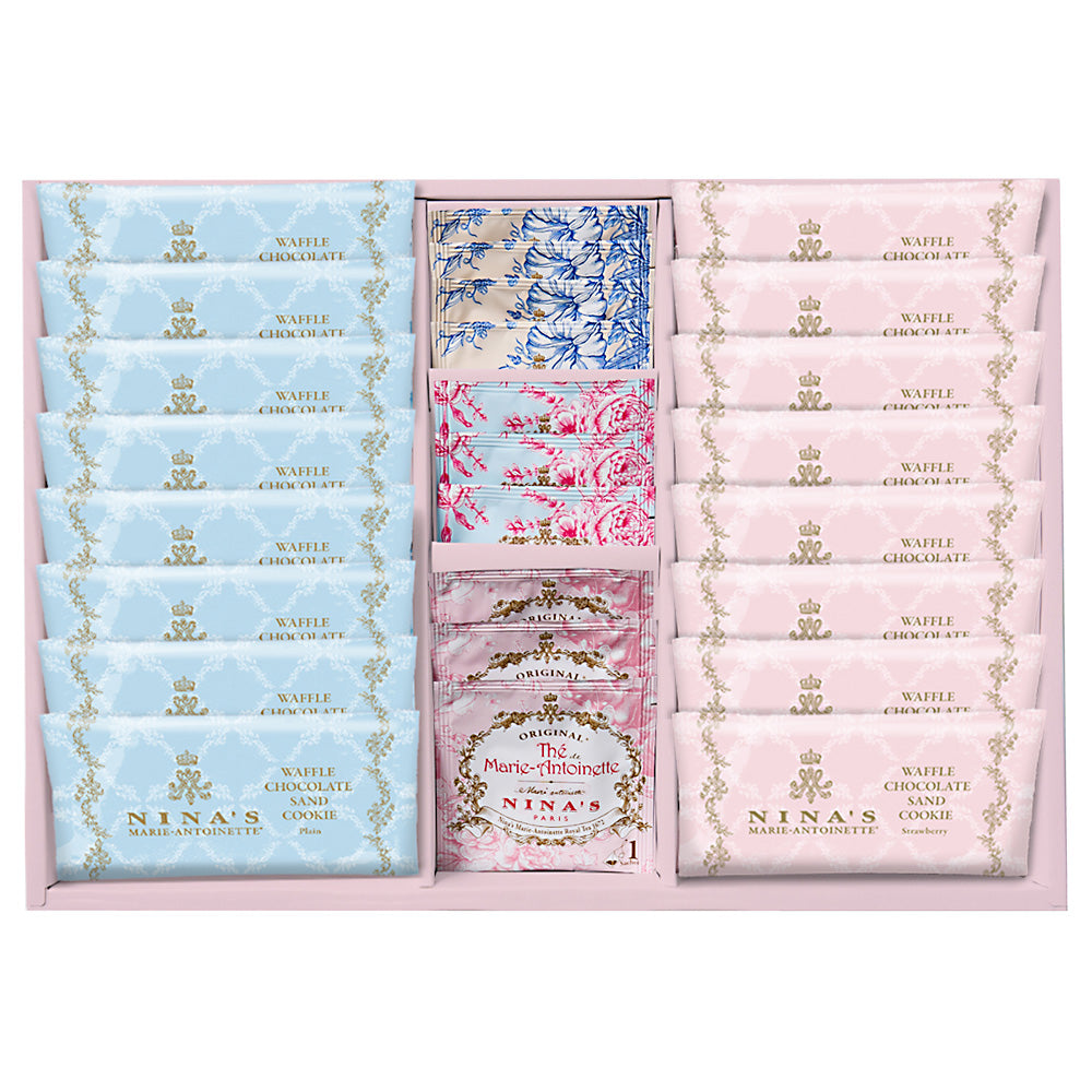 - セット内容:ロイヤル シークレット ガーデン(ニナス オリジナル マリー・アントワネット ティー・ロイヤル ダージリン×各3袋、ジャスミン インペリアル×4袋)、ワッフルチョコレートサンドクッキー(プレーン・ストロベリー×各8枚)