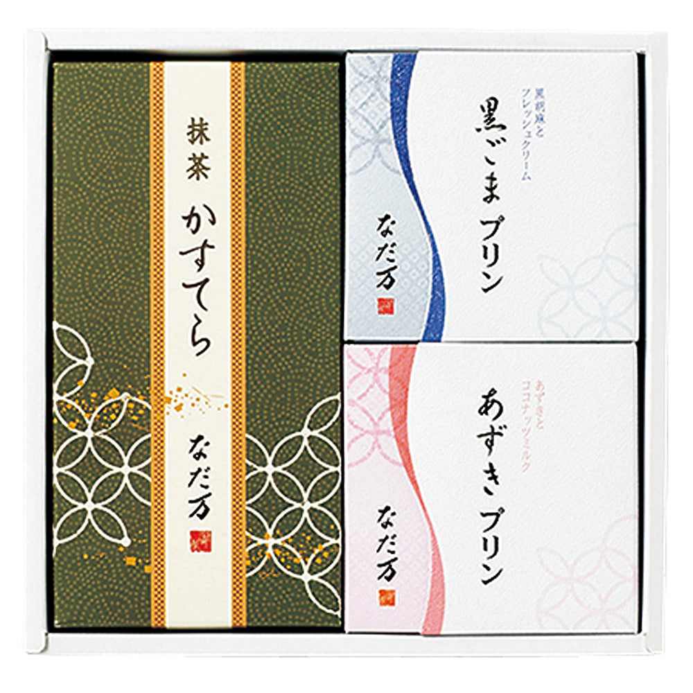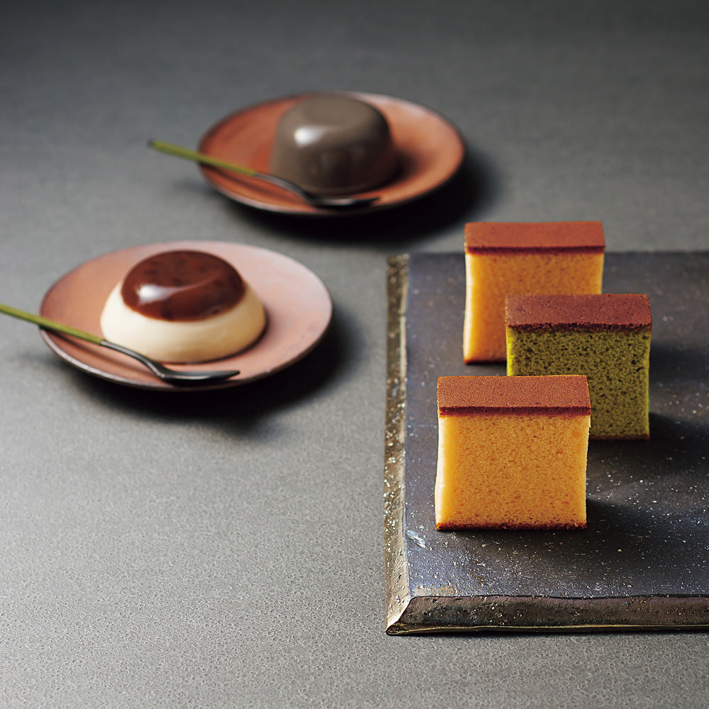 1830年(天保元年)に大阪で創業された「なだ万」。国産小麦を使い、もっちりした食感と独特のしっとりした口当たりのかすてらと、ココナッツミルクなどの洋の素材を取り入れ、小豆・黒ごまの和素材を組み合わせた風味豊かなプリン。どちらも老舗にふさわしい、伝統を感じさせる味わいです。