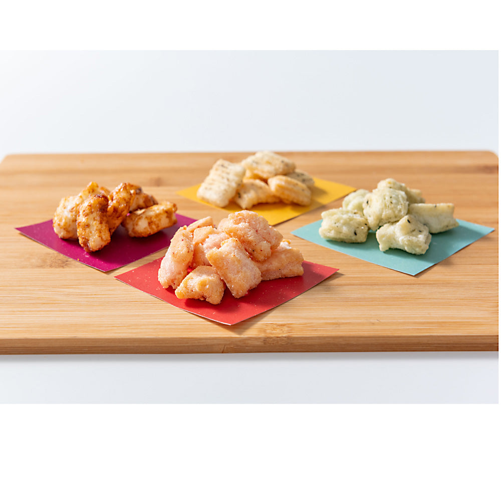 - セット内容:手揚げ京あられ×10袋(旨み香る干し海老と伊豆大島の海塩16g・甘く香ばしい炊き出し醤油15g×各3袋、ふわりと香る国産海苔と伊豆大島の海塩17g・黒胡椒と香り立つ燻製チーズ14g×各2袋)