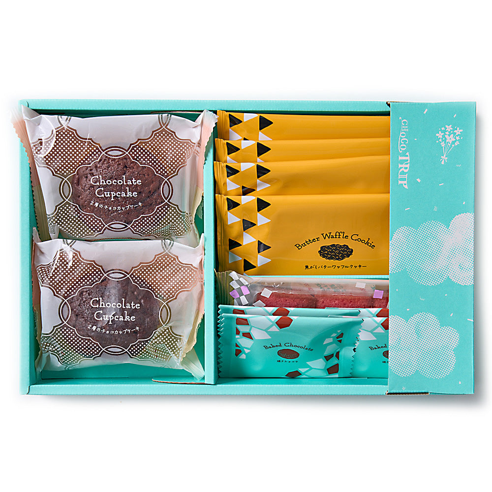 - セット内容:2層のチョコカップケーキ×2個、焼きショコラ×4個、焦がしバターワッフルクッキー×4枚、プチフィナンシェ(フランボワーズ)×1袋(3個入)